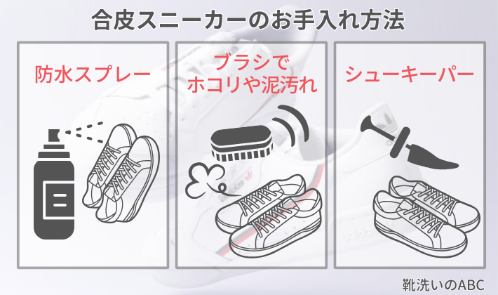 合皮スニーカーをきれいに履き続けるためにも、お手入れもかかさず行いましょう。